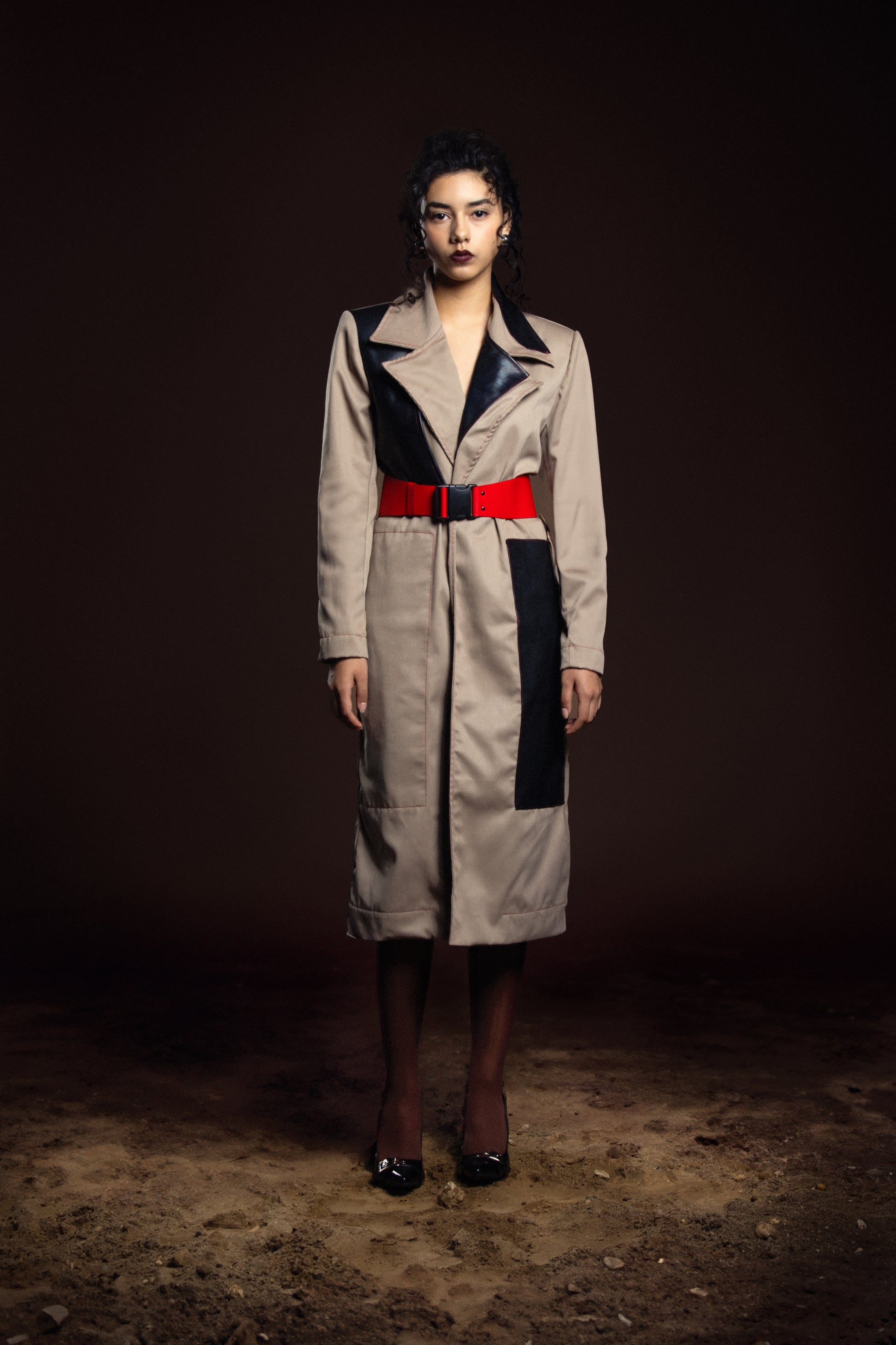 Una reinterpretación del uniforme clásico, la gabardina en tono beige se eleva con detalles que cuentan historias: parches gráficos en el busto y la bolsa oculta, pespuntes en rojo que subrayan su carácter y un biés negro en el interior que resguarda la esencia oculta de la prenda. Sus mangas largas y cuello estructurado la convierten en símbolo de autoridad y resistencia.