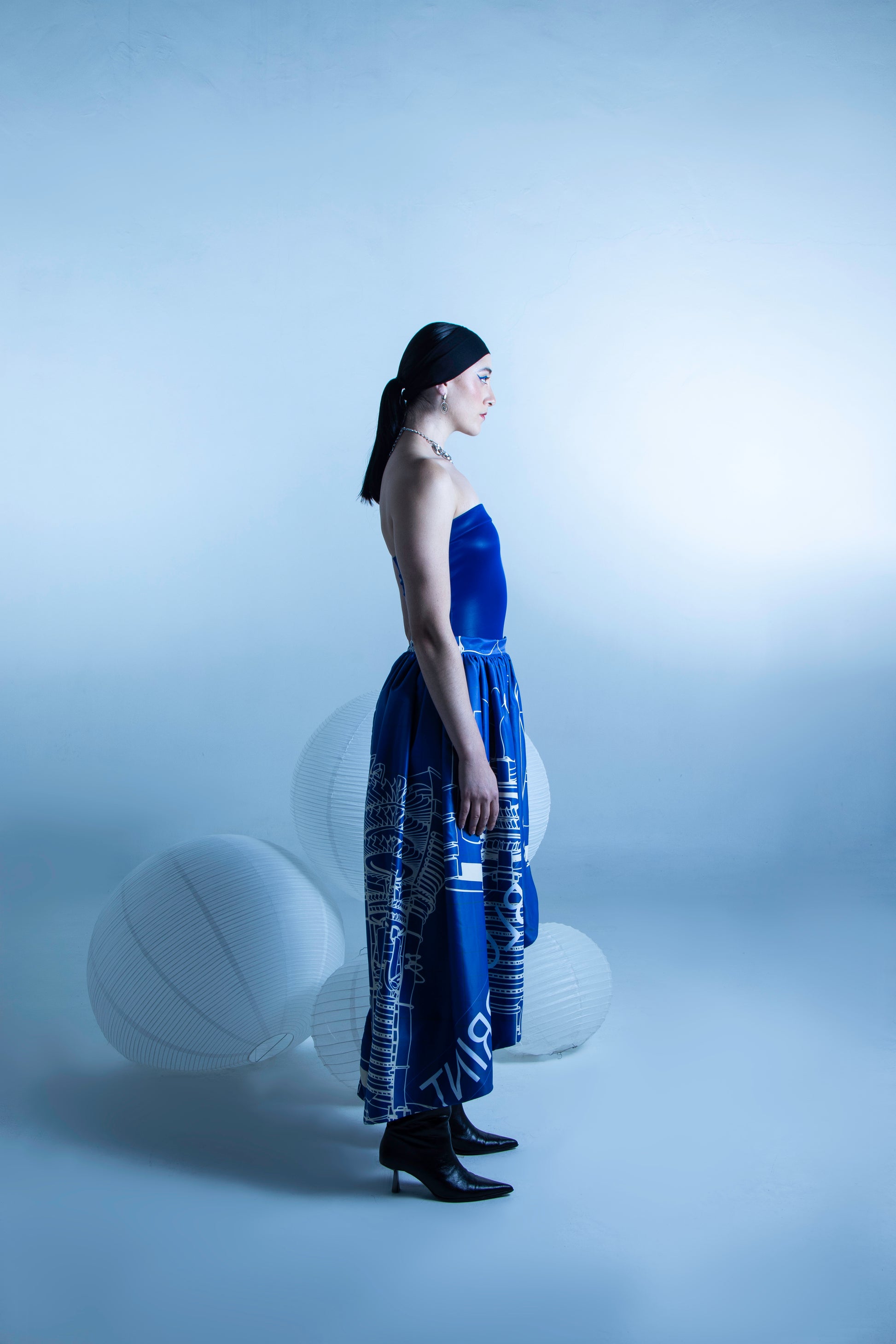 Falda asimétrica azul eléctrico , con un gráfico de blue print en color blanco, forrada en azul electrico con una cadena lateral, para mejor ajuste.