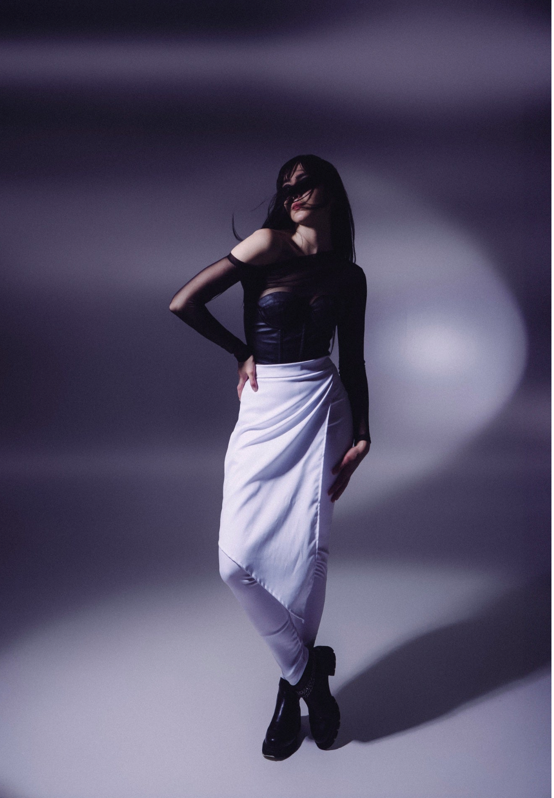 Blusa de mesh en negro, manga larga asimétrica